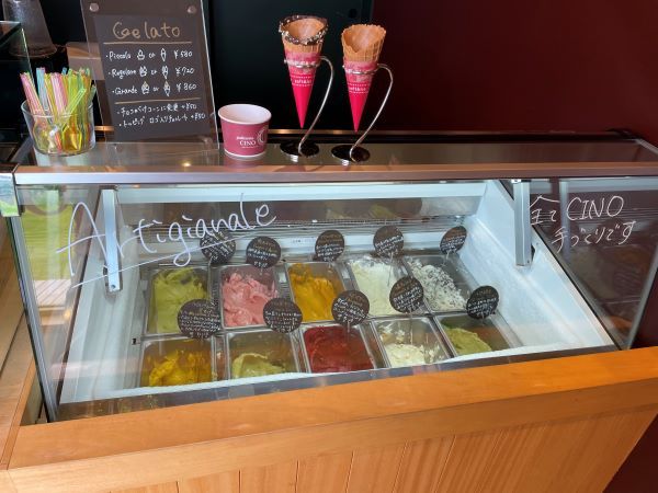 ここCINOの立地を思う存分味わうことも忘れずに! 店内飲食は出来ませんが、店舗前の芝生で購入したものを食べることができます。切り株の椅子って座ったことありますか? この日は、ジェラートの ”味覚” に加え、背振山系の山々、店舗前の芝生の緑で ”視覚”、那珂川のせせらぎの ”聴覚” を研ぎ澄ます親子が、楽しい時間を過ごしていました。 皆さんも、那珂川の「Pasticcerie CINO(パスティッチェリア チーノ)」で、新たな発見、出会いをしてみませんか?