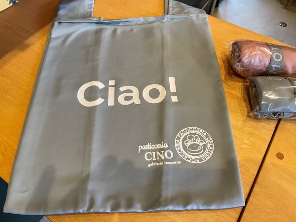 ワインの下に置かれていたのが、オリジナルのエコバッグでした。 Ciao!(またね!)と、ゴキゲンなカエルマークのキャラクターが言っているようです。 これを持っていれば、もう常連ですね。