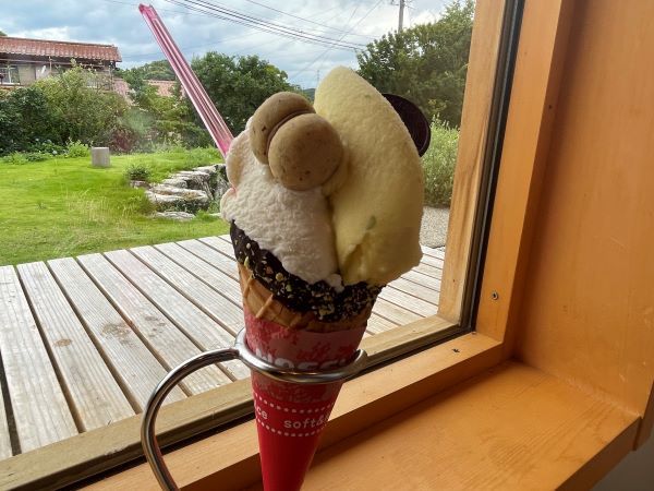 今回は、縁にチョコレートがかかったコーンに、パイン&バジルとミルク&バニラの2種。 さらに、焼き菓子コーナーから自家製レモンピールをタップリ使った ”リモーネ” をトッピング! ‥、の筈が、リモーネが大きすぎて敢え無く断念。