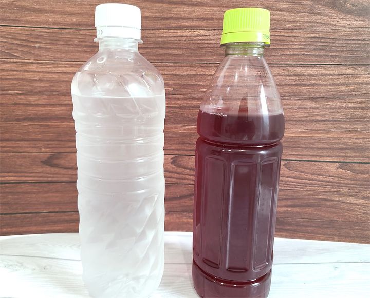 1. ペットボトルの中身を7~8分目くらいにして、冷蔵庫で冷やします。今回わたしは水と果汁20%のグレープジュースで実験してみました!