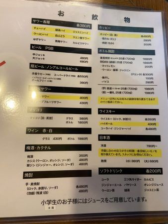 サワー・日本酒・ビール・カクテル等お酒の種類も豊富でした。小学生未満のお子様にはジュースを用意してくれます。店主様におすすめをお聞きするとメニュー表の黄色い部分がおすすめメニューのとのことです。訪問した際、何を注文しようかまよった際は、ぜひメニュー表の黄色から注文してみてはいかがでしょうか?? もつ煮ライスやもつ煮カレーのお持ち帰りメニューもありますよ。