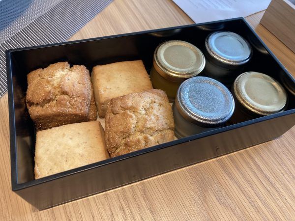 お次は焼きたてのスコーン。 プレーン、檸檬とパピーシードの季節のスコーンの2種類です。 でき立てが何よりも嬉しいスコーン、小瓶に入ったトロピカルなジャムとリコッタチーズを合わせて、二度三度と美味しくいただきます。