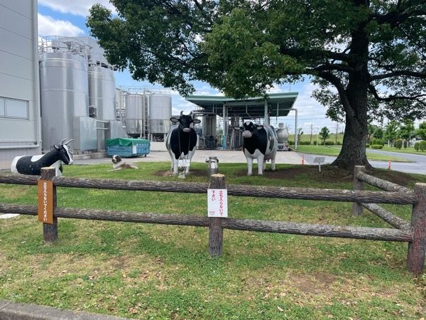工場前は広々!牛さんの模型もあり、緑もきれいでまるで牧場の様ですね。