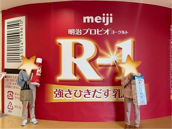 まずは、小さいホールに集合して、簡単な説明を受けた後は明治といえば!R-1ヨーグルトドリンクタイプが試飲できます。