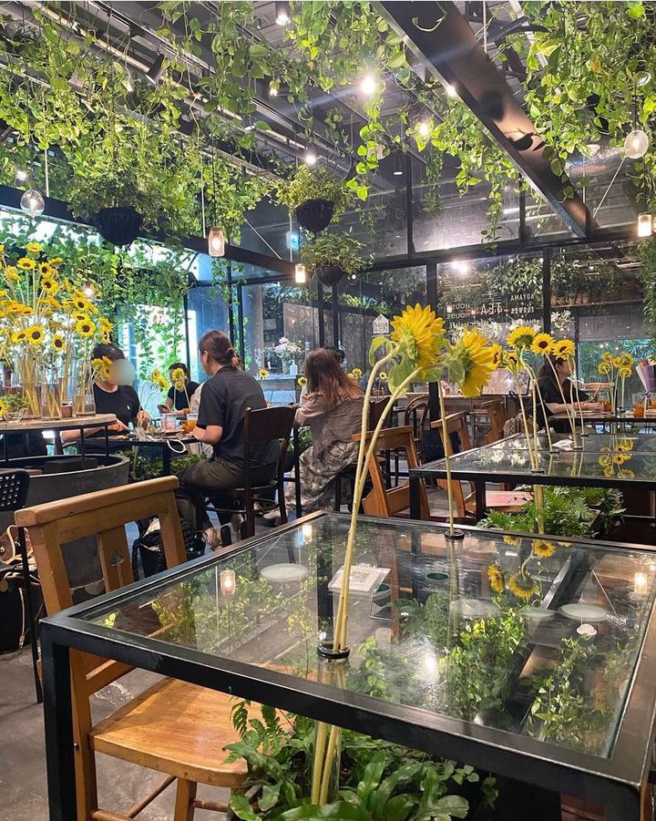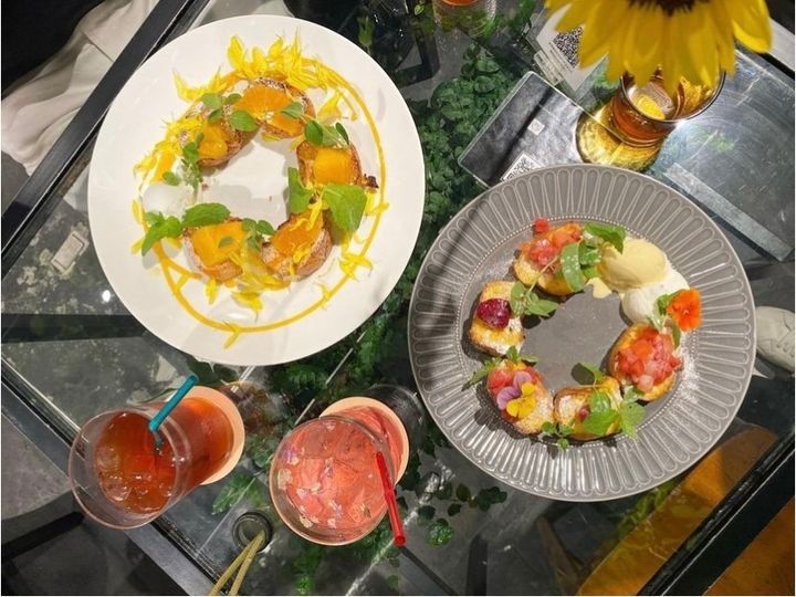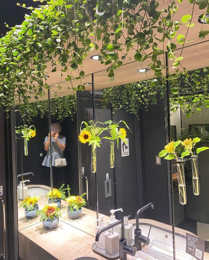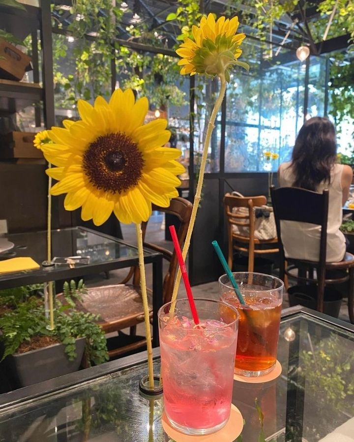 各テーブルに埋め込まれた一輪挿しにも向日葵が生けてあり、お料理や自分と一緒に写真に収めることができます。壁には造花のグリーンが敷き詰められていて、どの席に座っても映える写真が撮れますよ。