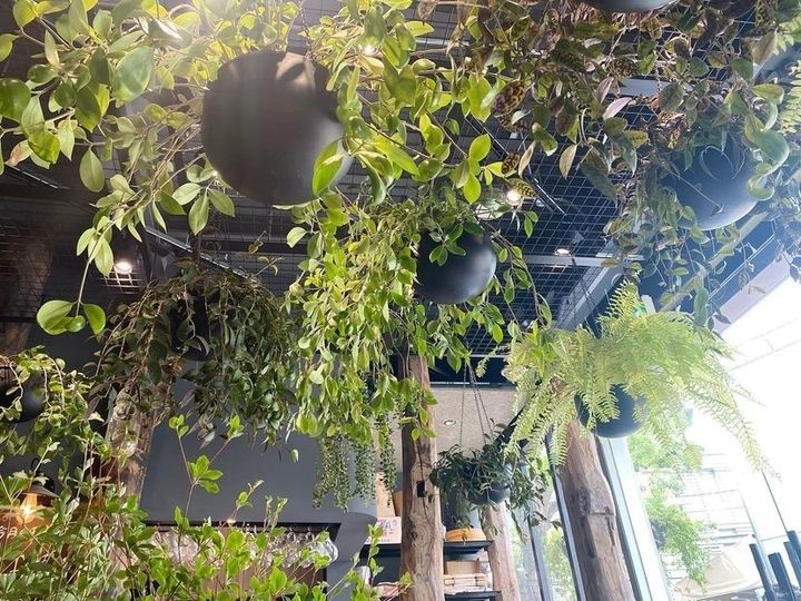 天井、壁、テーブルの上、どこを見ても植物がいっぱいの癒しの空間が広がっています♡避暑地のような穏やかな時間が流れていました。