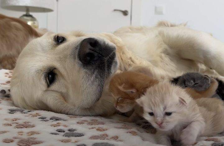子猫のお昼寝にも付き合うよ♡ 面倒見がいいゴールデンレトリバーさん。