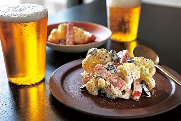 カリフラワー、ベーコン、オリーブという相性のいい組合せ。マスタードがピリッと効いたマヨネーズで和えて大人の味わいに。ビールはもちろん、日本酒や焼酎にも合います。