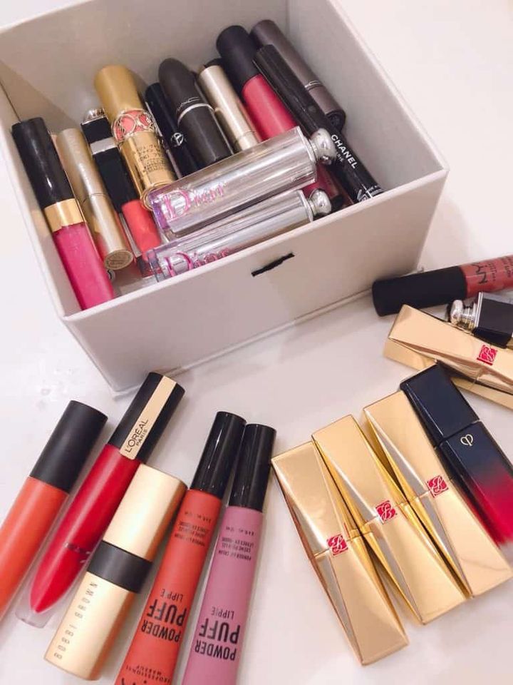 「これはコレクションの一部。乾燥しない付け心地のものを中心に集めています。クレ・ド・ポー ポーテのルージュリキッドルミヌ マットやアルマーニのエクスタシーラッカーがお気に入り。仕事で色々と付けることが多いので、最近さらにリップ集めにハマっています」