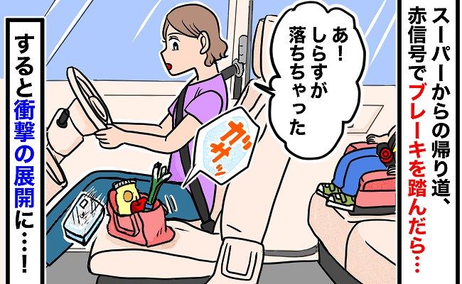 帰宅途中、信号が赤に変わってブレーキをかけた途端、助手席に置いていたエコバッグからしらす干しが助手席に落ちてしまいました。足元に暖房を入れていたので、傷んでしまうと思った私はブレーキを踏んだまま、助手席の足元に手を伸ばしました。そのとき、なんとブレーキから足を離してしまったのです……!