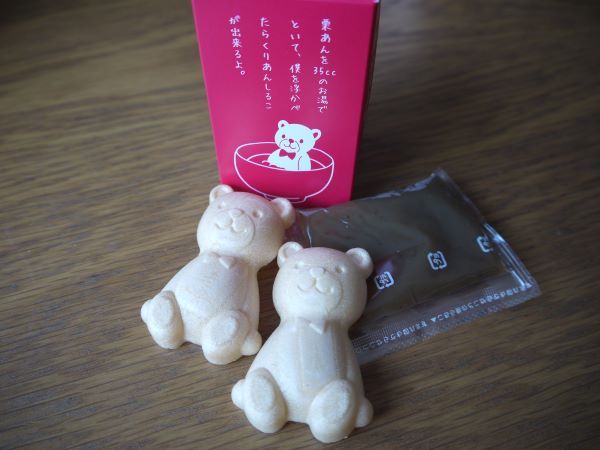 かわいいくまさんの形の最中皮に栗あんをはさんで食べるセルフもなか。あんを35ccのお湯でといてくまをうかべてお風呂みたいなおしることして食べることもできるのが楽しい! 小倉あんのくまさんもあります。