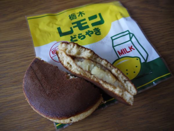 栃木限定レモンミルク餡(レモン風味の白あん)のどら焼き。なぜレモンミルクかというと栃木には「レモン牛乳」というソウル飲料があるらしく、そのどら焼きバージョンだとか。黄色いあんこのほのかなレモン風味がさわやか。