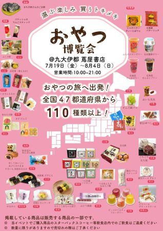 開催場所は福岡市西区の新興スポット「九大伊都蔦屋書店」の店内。ここで、全国各地のご当地おやつが集結するイベント『おやつ博覧会』と全国の有名店のプリンを一堂に集めたイベント『ニッポンのプリン』が開催されています。