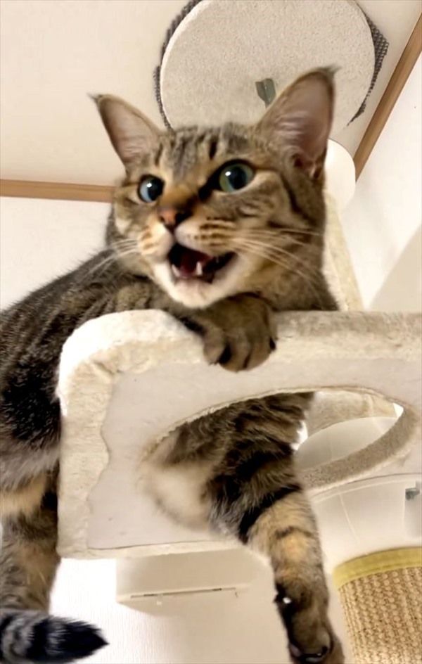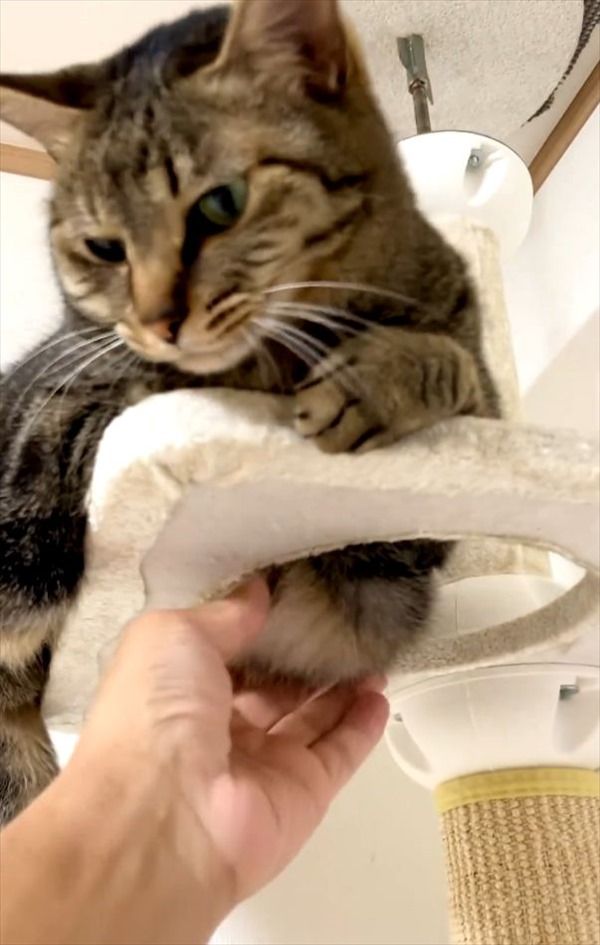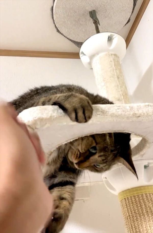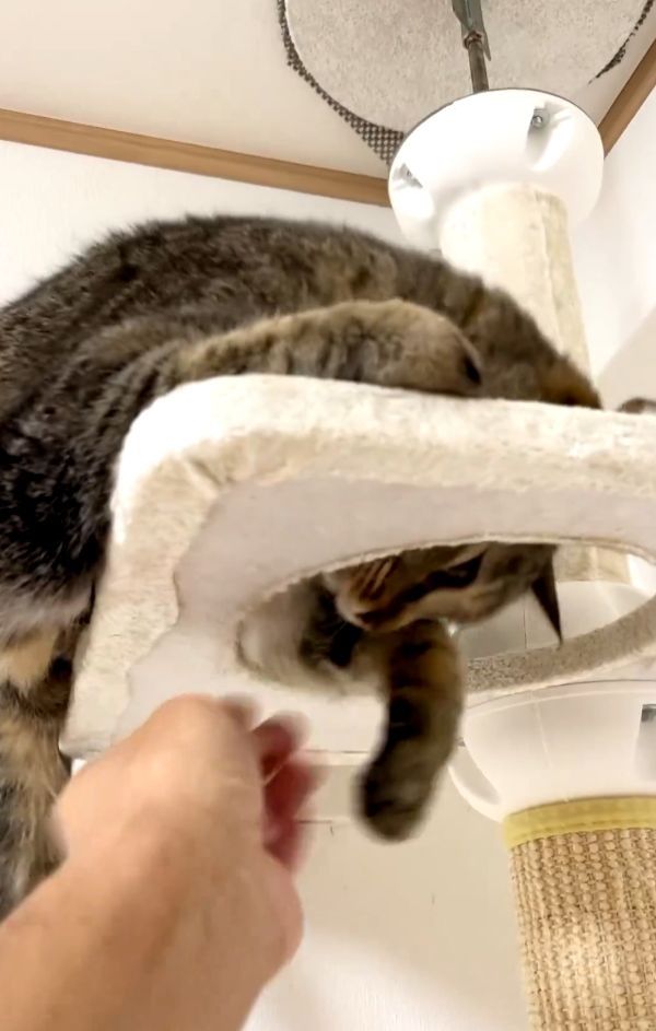 キャットタワーの上にいるのは、キジトラの『小豆』ちゃん。 はみ出している小豆ちゃんのお腹を触ろうとした飼い主さんですが・・・