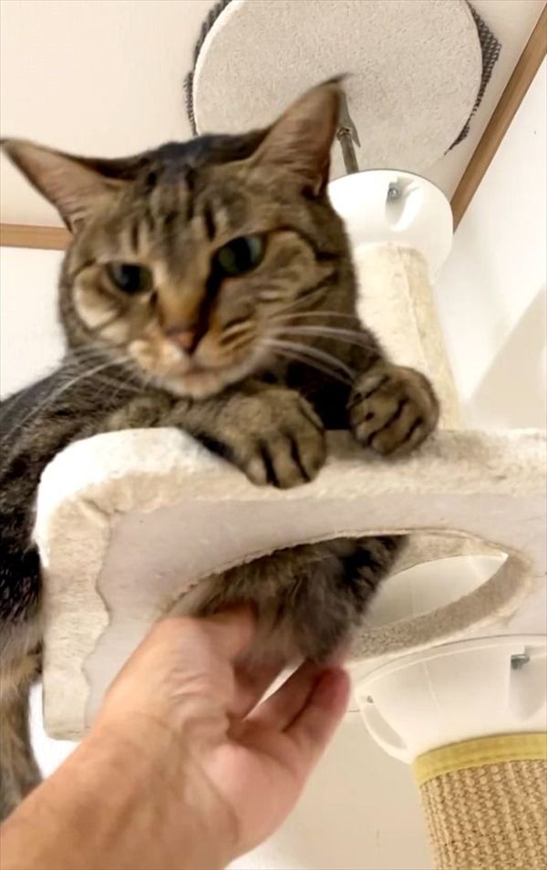 キャットタワーの上にいるネコ。 このネコの体が少しキャットタワーからあふれていたので、手を伸ばそうとした飼い主さん。