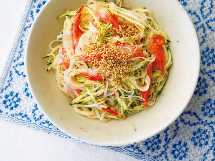 ごま油が決め手!『生ズッキーニとかにかまのそうめん』のレシピ【あえるだけで簡単】