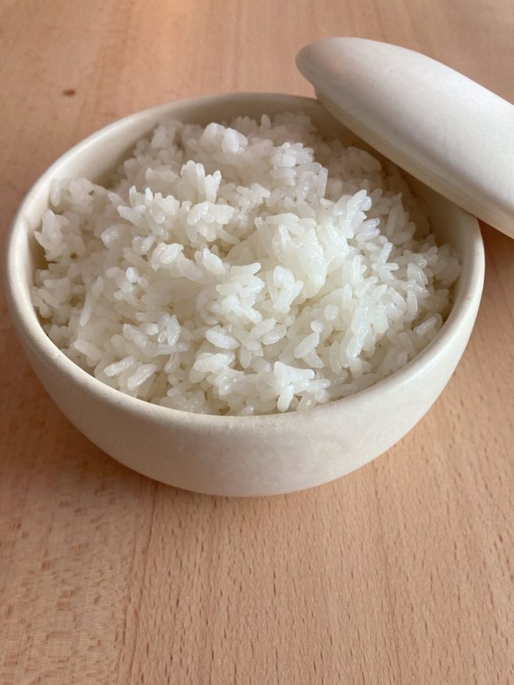 レンジで加熱できる陶製のおひつです。前夜のごはんが残って、翌日の「置きごはん」にまわしたいときに、この陶製おひつに入れて冷蔵庫で保存し、翌日レンジ加熱すればOK。残りごはんは冷凍にしても問題ないのですが、冷凍ごはんって、加熱時間が長くなったり、加熱後の熱くなった容器が子どもには扱いにくかったりしますよね。その点このおひつは温め直しでもまるで炊き立てのように美味しい状態になる上に、加熱後の容器も熱くなりすぎず、扱いやすいんです。写真は2合タイプですが、1合もあるので、そちらの方がより持ち運びやすいと思います。残ったごはんを混ぜご飯にして保存しておくと、翌朝さらに「置きごはん」の準備がラクになるので、私はゆかりと枝豆やひじき煮などを混ぜ込んでしまうことが多いです。デザインもシンプルでテーブルに出しても洒落た感じになるのも気に入っています。