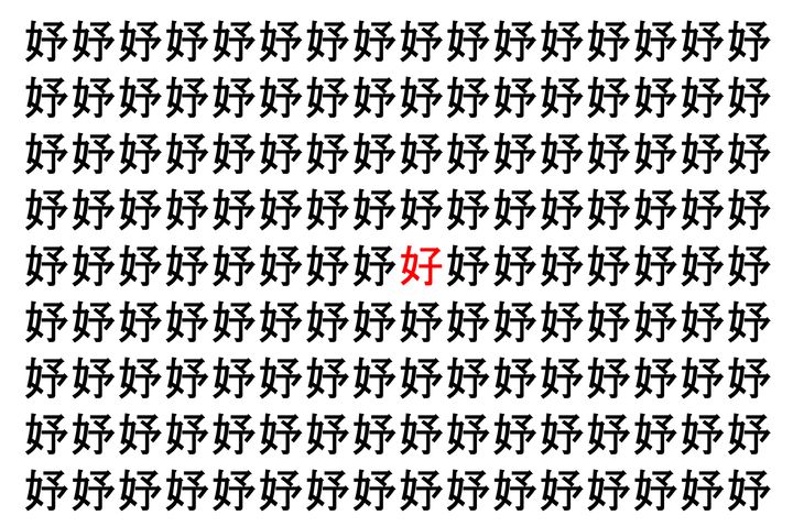 画像の中には、「妤」という漢字が縦に9行、横に16個並んでいます。 全部で144個となりますが・・・、そのうち1つは「異なる漢字」となってますよ!!