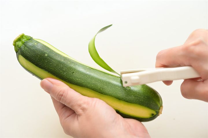 1. ピーラーで、ズッキーニの皮を縦にむいて縞模様を作る。