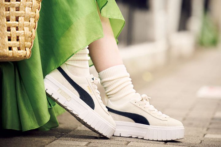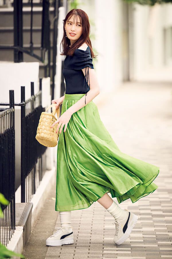 オフホワイトでスッキリまとめた足元なら、華やかな美色スカートにもすんなりとなじみよし♪ 目新しい組み合わせで、こなれ感と今っぽさを劇的アップ!