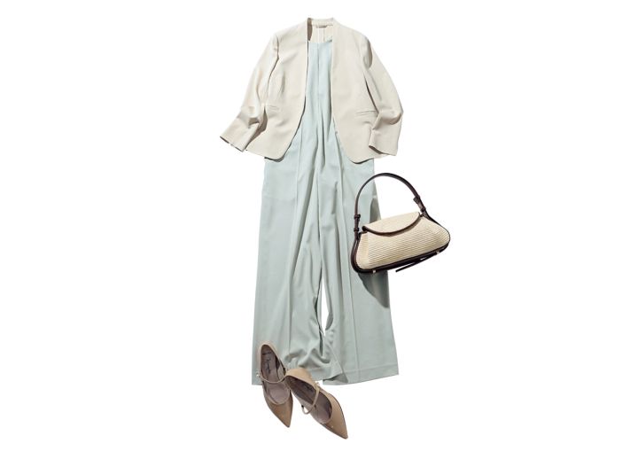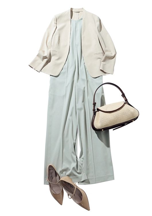 オールインワンとジャケットで動きやすい爽やかスタイル。プレーンなノーカラージャケットは、何と合わせても上品でスマートになっちゃう。通勤服にもなじむラフィア風バッグで夏ムードもプラスして。