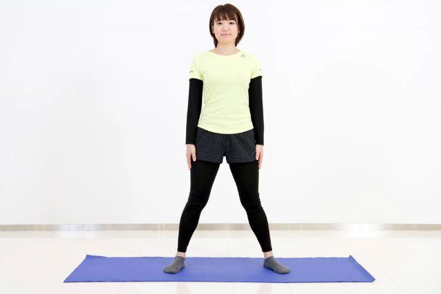 (1)背筋を真っ直ぐ伸ばして立ち、脚を肩幅よりも少し広めに開く