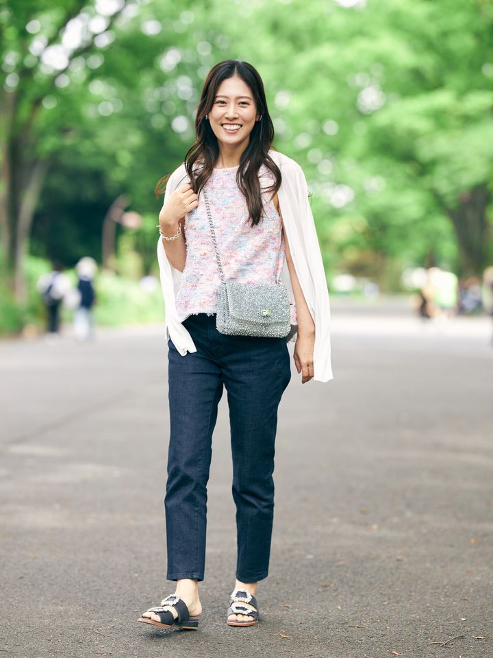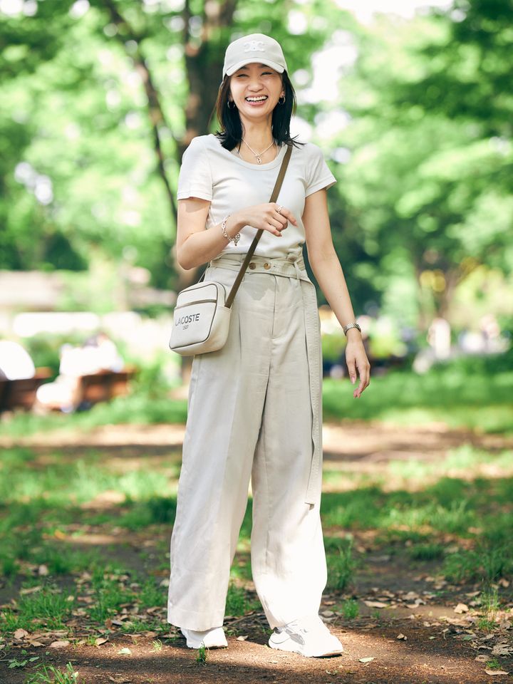 「公園の見守りはもちろん、通勤時もフェイスカバーやアームカバーは必須アイテム。でも日焼け対策を優先しすぎて、子どもがお迎えのときに別のママと間違えてしまったことも(笑)。せっかくしたおしゃれも無駄になってしまいそうなので、それ以降は気を付けるようにしています。日焼け止めは、持ち歩きの荷物が増えるのが嫌で子どもと兼用できるタイプを探しました。キスミー マミーはサラサラで伸びやすく、無香料なので娘も嫌がらず塗ってくれます。UV対策以外にも夏場は化粧崩れも意識していて、コーセーのメイクキープミストは手放せない名品。ファンデーションのあとに使っています」藤原沙由里さん・157㎝/会社員(4歳女の子ママ、撮影時妊娠7カ月)