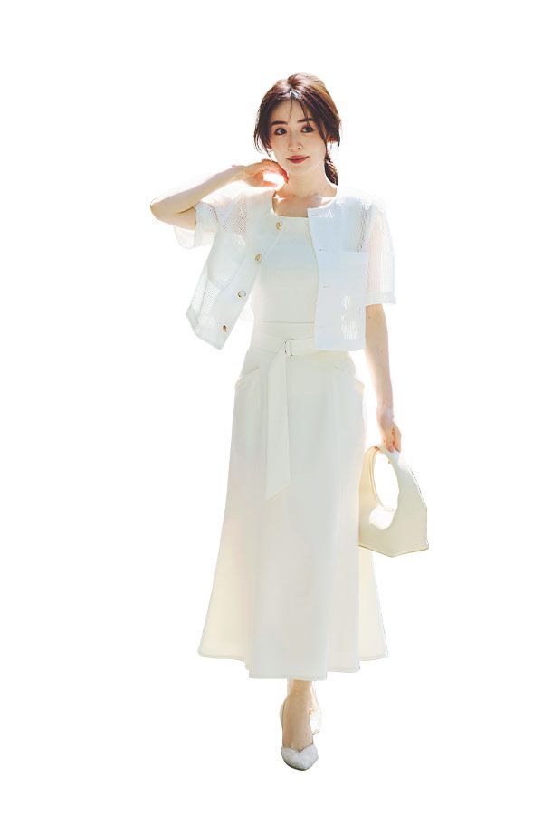 軽やかで抜け感も十分なメッシュ素材の半袖ジャケットを夏通勤の羽織りに投入。全身ホワイトでまとめて、透明感もしっかりキープ。