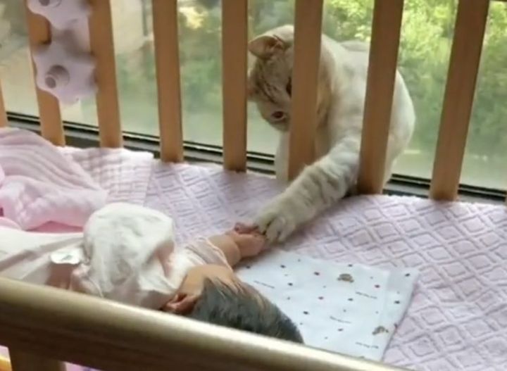 ちょっとだけなら良いかニャ?赤ちゃんに触れたい猫。