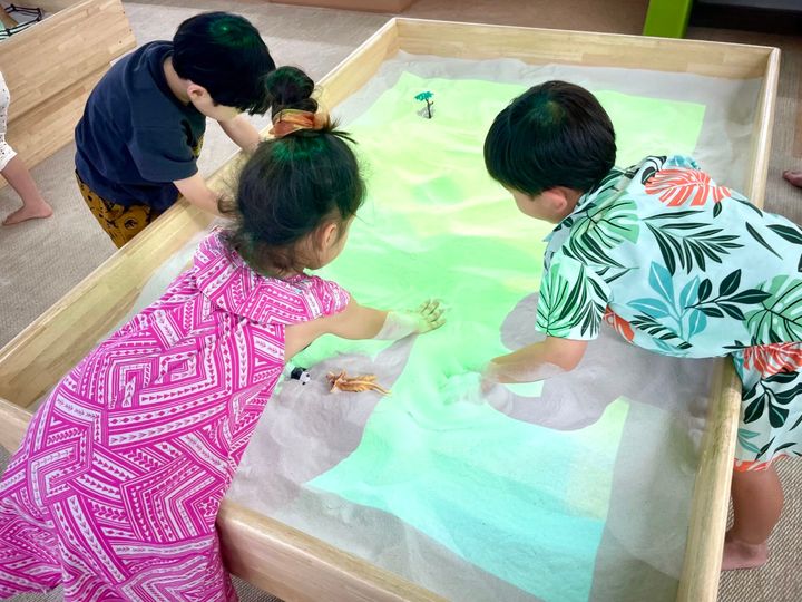 こちらは恐竜や動物のフィギュアがたくさん置いてあるAR砂場です。山を作ると火山が映し出されたり、川が流れたり、本当に不思議!子どもも大人も大興奮です。