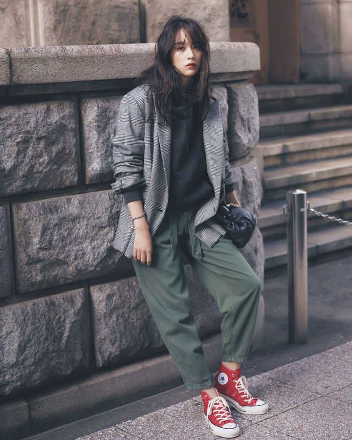 パンツ¥35,200(ポロラルフ ローレン/ラルフ ローレン)ジャケット¥75,900(サクラ/インターリブ)フーディ¥22,000(スローン/ザショップ スローン 新静岡セノバ店)バッグ¥203,500(ザンケッティ/八木通商)スニーカー¥14,300(コンバース/コンバースインフォメーションセンター)ブレスレット¥9,350(イン ムード/フォーティーン ショールーム)