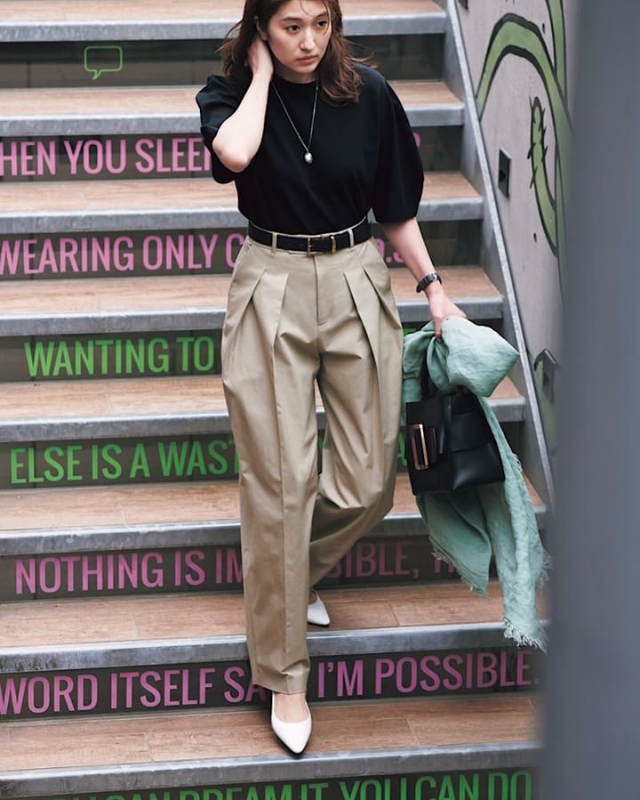 Tシャツ¥14,300(ADAWAS/ショールーム セッション)パンツ¥24,970(ネイブ)バッグ¥236,500(ボーイ/トヨダトレーディング プレスルーム)パンプス¥49,500(ペリーコ/アマン)ベルト¥15,400(アルアバイル)ストール¥28,600(アソース メレ/アイネックス)ネックレス¥39,600(マリハ)時計¥31,900(リップ/エイチエムエスウォッチストア 表参道)