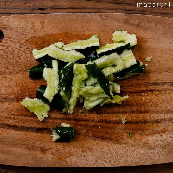 1: きゅうりは麺棒で軽くたたいて、手で食べやすい大きさにちぎります。