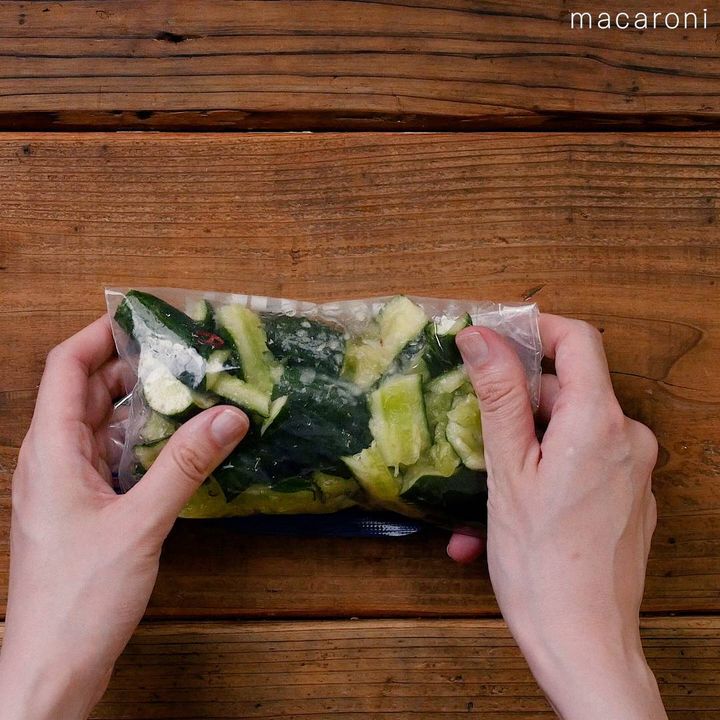 2: ジッパー付き保存袋にきゅうり、しょうが、白だし、輪切り唐辛子を入れてよく揉み込みます。