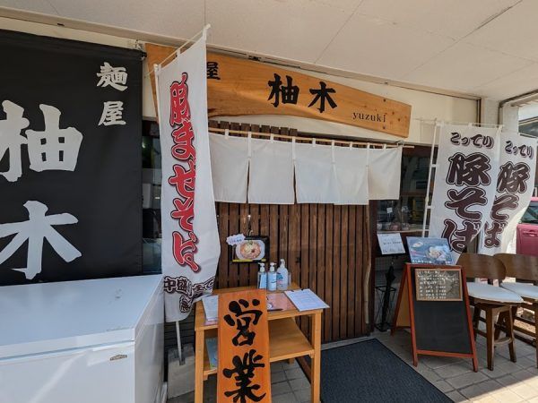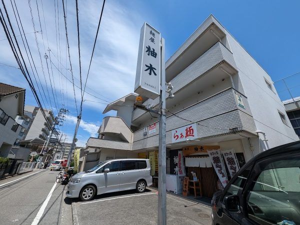 白いマンションの1階に「麺屋柚木」さんがあります。 駐車場も完備していて駐車スペースは店名が書かれた縁石が目印。 車を停めて早速お店の前に。