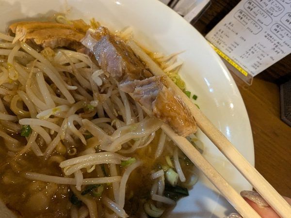 じっくり煮込まれたチャーシューはホロホロ。 そして分厚いあつみで食べ応えばっちり。 食べ比べで、しっとりレアチャーシューも楽しめる特豚そばが人気なのが納得です。 途中でラー油やカラメなども入れて味変で二郎系を楽しみながら完食!