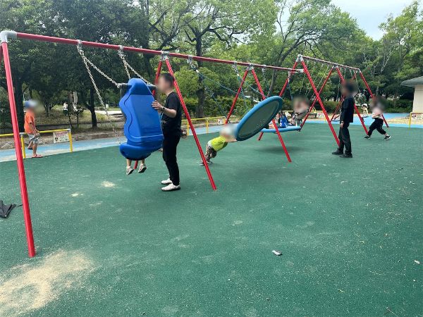 座ったり寝そべったりできる円盤型や、背もたれがあるチャイルドシート型など見たことないブランコが登場していました。