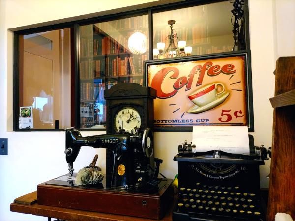 初めて入店する時は、知らないお宅に訪問するかのようでちょっぴり緊張しますが、一歩足を踏み入れると、そこはまるで日常と非日常の境界線のよう! 玄関には、アンティークなミシンや古時計が並ぶ素敵な空間がお出迎え。これから過ごす特別なカフェタイムへの期待が高まります。