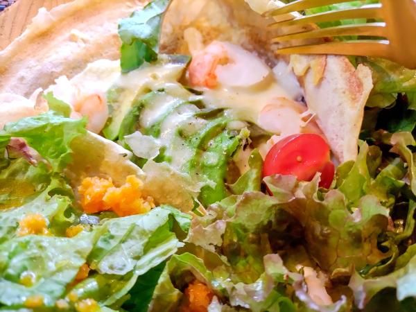 今回注文したのは、『エビとアボカドのガレット』。生地をそっと開くと、プリプリのエビと濃厚なアボカドが顔を出す、まさに食欲をそそるビジュアルです! 生地は名店の蕎麦粉を使用しており、外側はパリッと、かめばモチモチとした食感。野菜もたっぷり使われているので、とてもヘルシーですが、意外とお腹いっぱいになります。