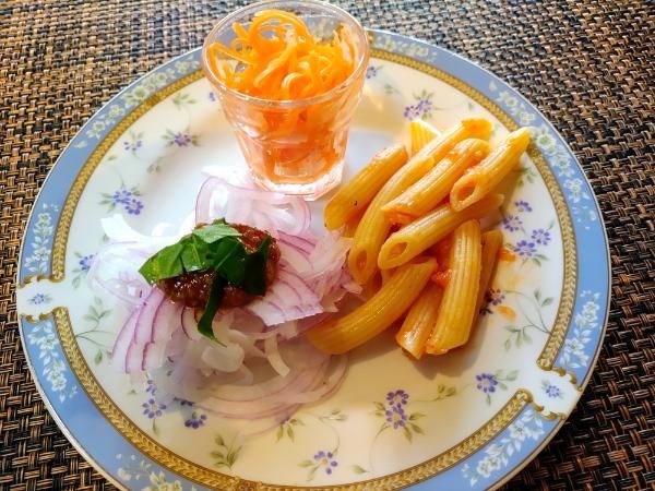 かわいい絵柄のお皿に、色鮮やかなパスタと2種類の野菜サラダが彩り豊かに盛り付けられています。ひと口食べるとペンネは、もちもちとした食感で、ソースとの絡みも抜群。野菜サラダはシャキシャキとした食感で、ドレッシングとの相性も絶妙です。