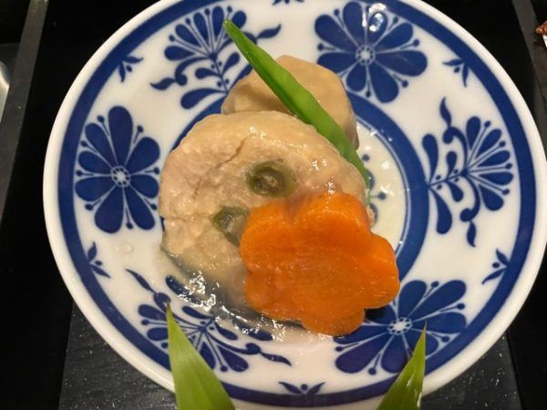 蓮根の挟み揚げのこっくりとした味わいに、にんじん、さといも、さやいんげんの上品な味。