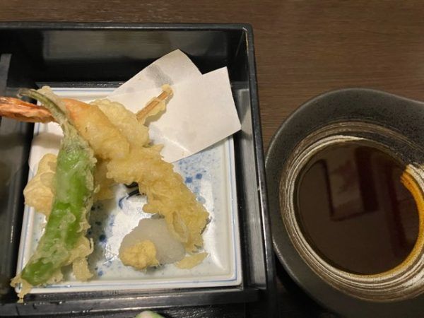 海老、ししとう、白身魚の天ぷらはサックサク。大根おろしとしょうがつゆでいただきました。
