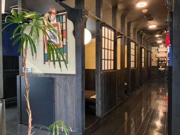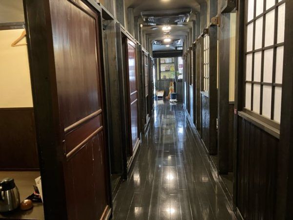 店内は和のしつらい。中央から左右に長い廊下が続いています。