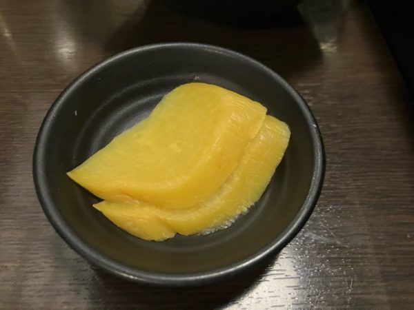 箸休めの香の物は、大ぶりのたくあん漬け。コリコリッとした食感が良いです。