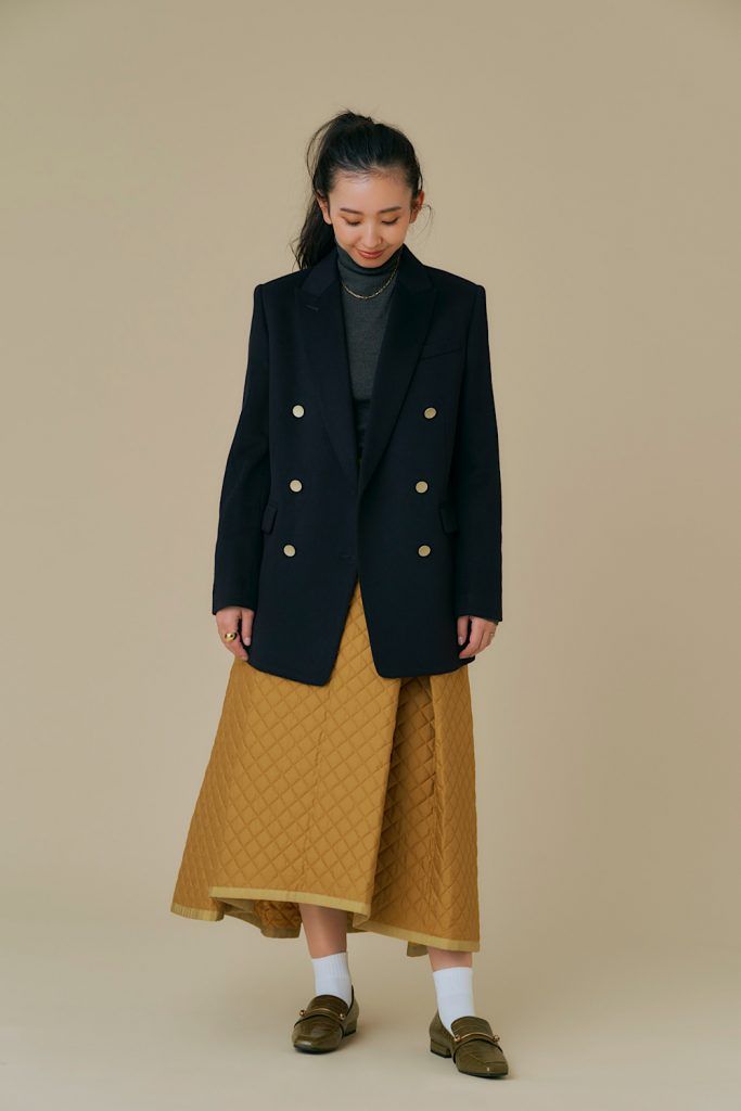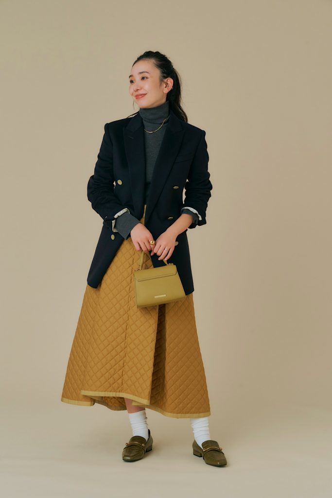 ソックス¥550(靴下屋/Tabio)タートル¥9,700(ミラ オーウェン/ミラ オーウェン ルミネ新宿2店)ジャケット¥107,800(ebure/ebure GINZA SIX 店)スカート¥48,400(フリッカ/フリッカ インターナショナル)イヤカフ¥33,000(ete)リング¥45,100ネックレス¥39,600(ともにLORO)バッグ¥8,900、ローファー¥6,900(チャールズ & キース/チャールズ & キース ジャパン)