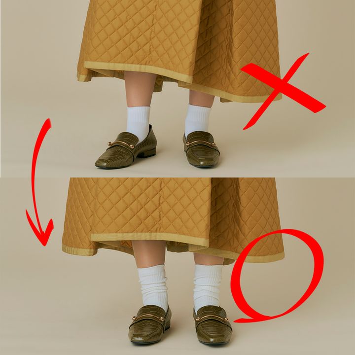 ミモレ丈のフレアスカートに合わせる靴下は、肌見せの割合が重要です。短めの靴下を合わせると、寒々しく見えるだけではなく、学生のような幼い印象に。どれだけコーデが完成していても、靴下ひとつで台無しになってしまう危険があるので、要注意です。