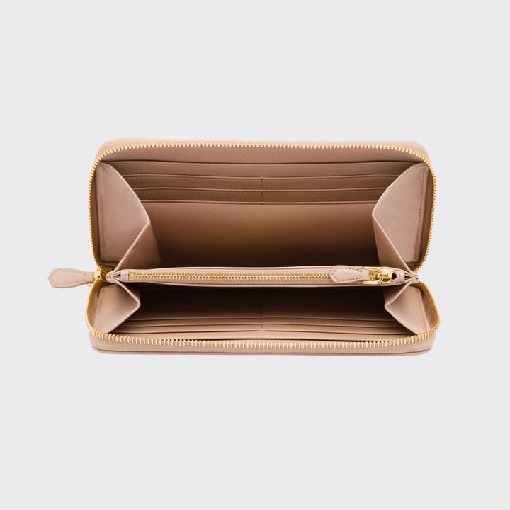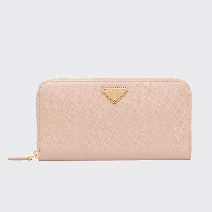もはやトレンドを超えた存在ともいえるトライアングルロゴが目印。優しげなピンクベージュのサフィアーノレザーとゴールドのファスナーがマッチ。[ヨコ20×タテ10㎝、札入れ2、カードホルダー12、内ポケット2、ファスナー付きコインケース1]財布¥133,100*予定価格(プラダ/)
