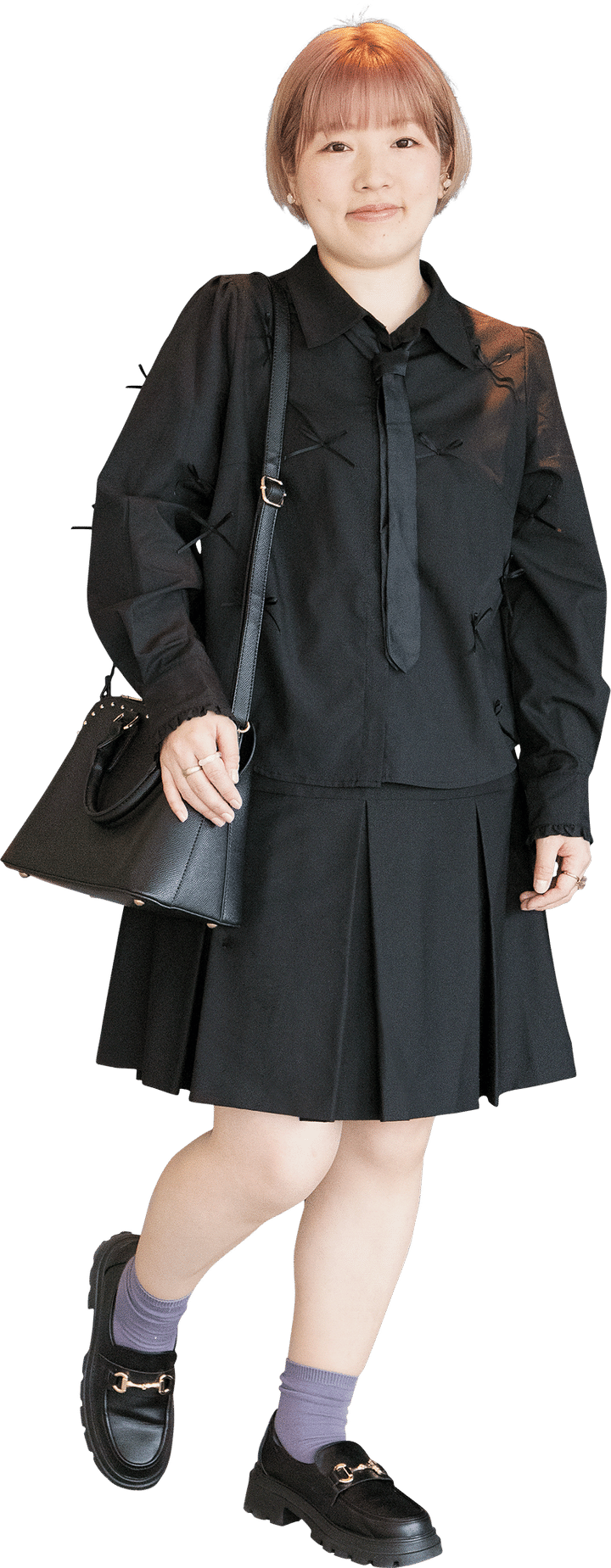 大好きな安藤うぃさんがプロデュースしたお洋服でコーデ! 黒コーデなので髪色はハイトーンのピンクベージュにチェンジ♪ソックスの紫を差し色にしました