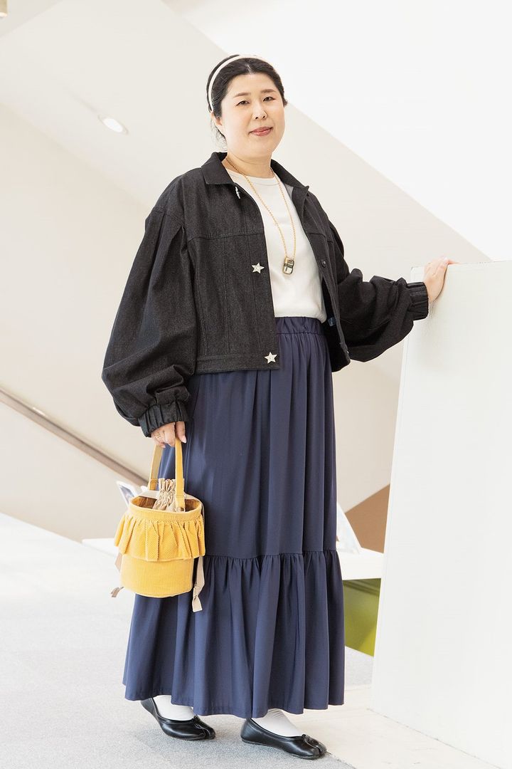デニムアウターを目立たせつつ春らしさも強調したかったので、小物をゴールドとイエローで明るい印象に。スカートはデニムに合わせたネイビーをチョイスしてみました! ●la farfa2024年7月号より。