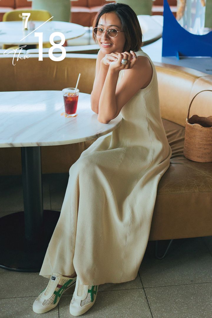 ワンピース¥24,200(ガリャルダガランテ)バッグ¥14,300(バリ・ワークスタット)シューズ¥12,100(オニツカタイガー)右手リング¥5,550、左手薬指リング¥34,100、左手人差し指リング¥15,400(ニナ・エ・ジュール)サングラス¥31,900(ブラン)
